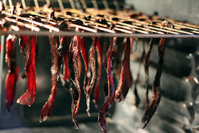 6. Set skewers on top rack in oven so beef strips dangle between the bars. Repeat until all beef strips in oven.